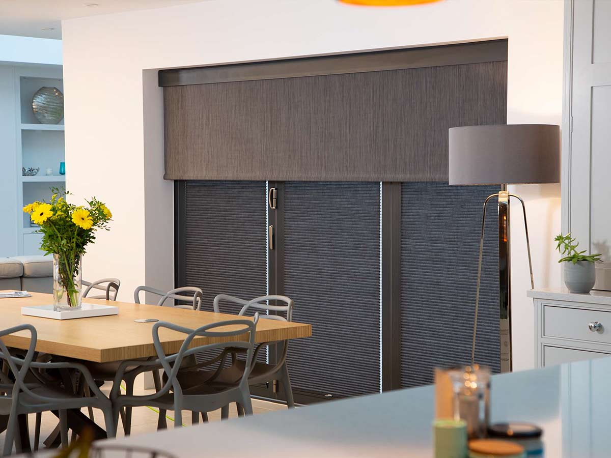 Explore our bespoke and modern electric blinds for bifold doors – expertly designed, free-hanging, motorised, reduced glare & heat, increased privacy.