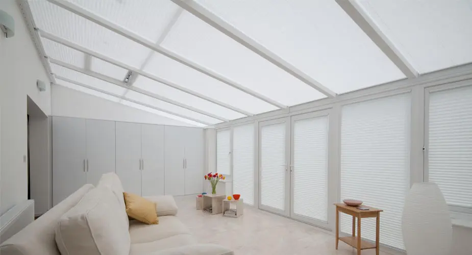 We recommend conservatory roof blinds and blinds along the sides of your conservatory. If your main reason for installing blinds is to combat volatile temperatures, we do recommend our Duette® conservatory blinds. The cellular texture traps in a layer of air creating an extra barrier between your conservatory’s glazing and the temperature outside. However our single-pleated blinds are also very effective as thermal conservatory blinds.