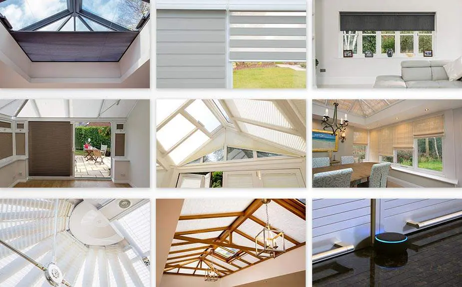 Our exclusive pure™ Pleated Blinds fitted into the roof, windows, doors and gable of this large bespoke conservatory; all controlled with our own puresolo™ motorised system.