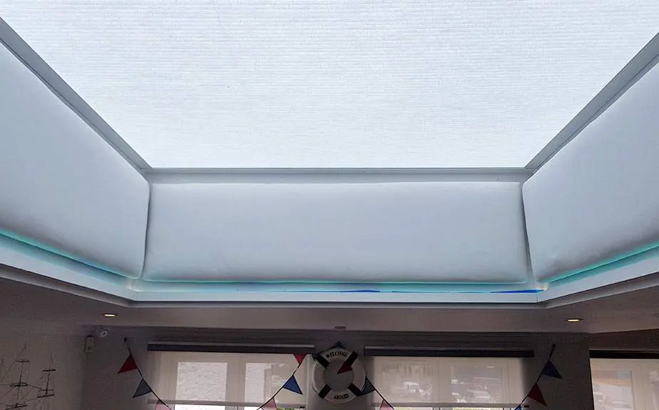 Horizontal blinds are an efficient way of shading a room with a roof lantern. We can cover the space with a small amount of blinds; in this case we were able to add shading to the room with just a single blind. The Duette® fabric we used has been designed to control the temperature in a room. It has a unique honeycomb structure creating an extra insulating layer. This means whilst keeping out the heat during a heatwave; the blind will retain the heat in the room during the winter.