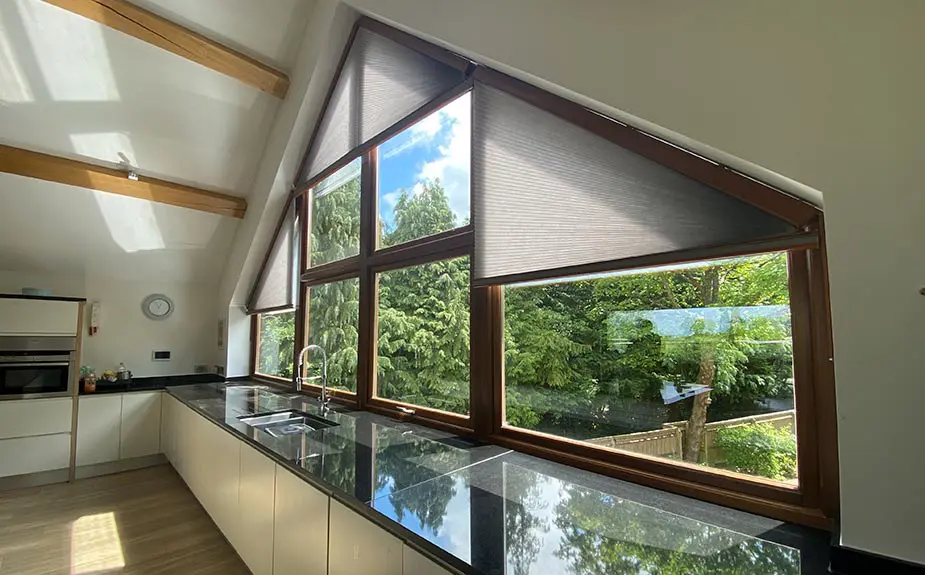 Bespoke window shapes are becoming a popular addition to a lot of properties, and we are seeing large apex shapes in various rooms in a home. As such we are having to fit our bespoke blinds in various different parts of the home; including large gable blinds in kitchen areas.
