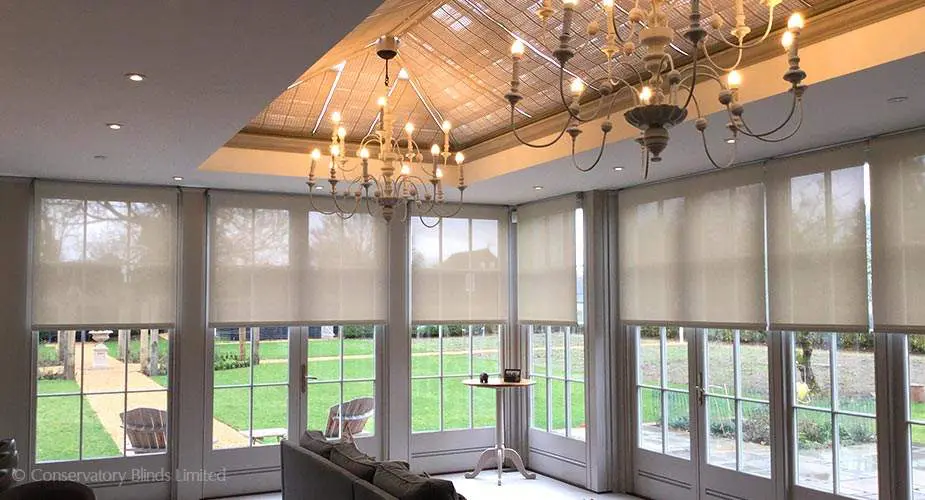 Orangeries, such as the image pictured above, often come with a large lantern roof, many doors or large side windows. In this case, you can cover your orangery from top to bottom with roller blinds. Since we would recommend roller blinds for your lantern roof and your side blinds, you can install matching blinds in both places for a cohesive look. Remote control blinds in this case, can shade your whole room in seconds.